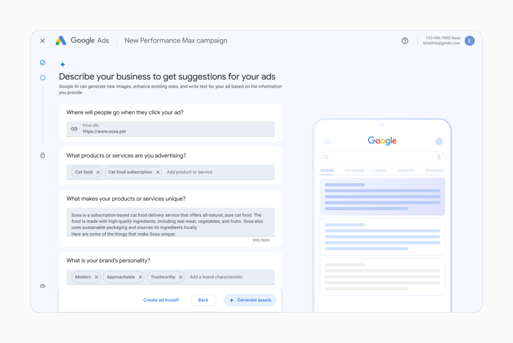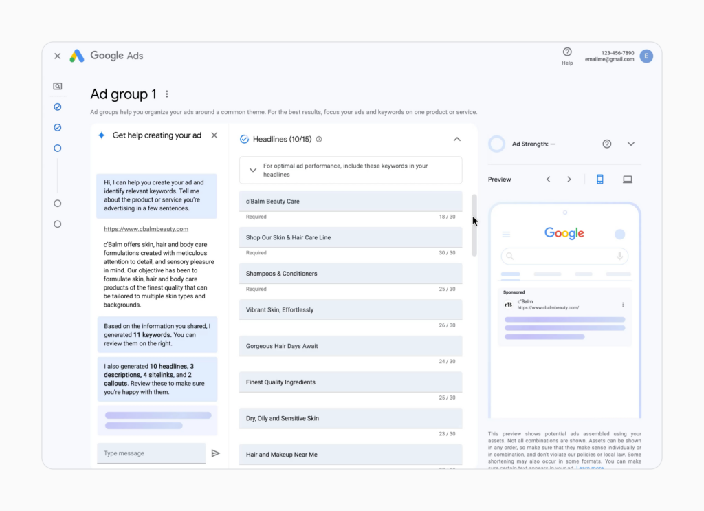 This means that an ad for “skin care for dry sensitive skin” can be dynamically tailored to match the user’s specific search query. Google is also working on incorporating a digital assistant into Google Ads, providing advertisers with AI-generated ideas and advice, making campaign creation a more interactive and intelligent experience.