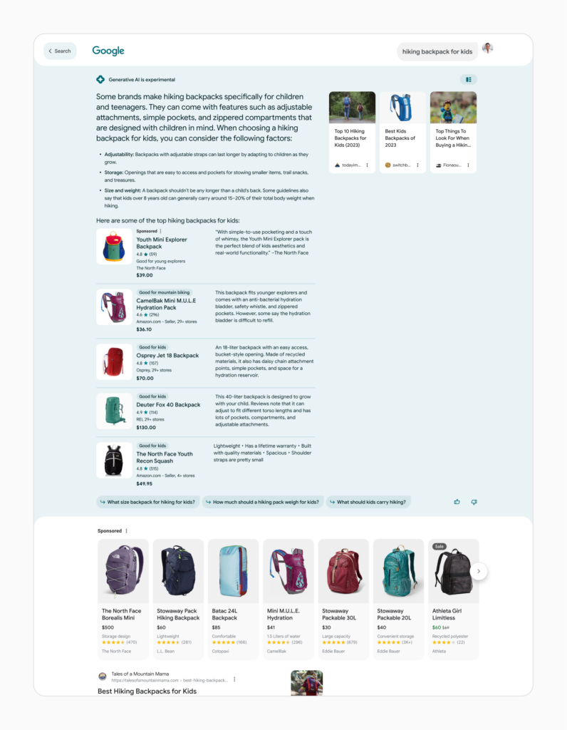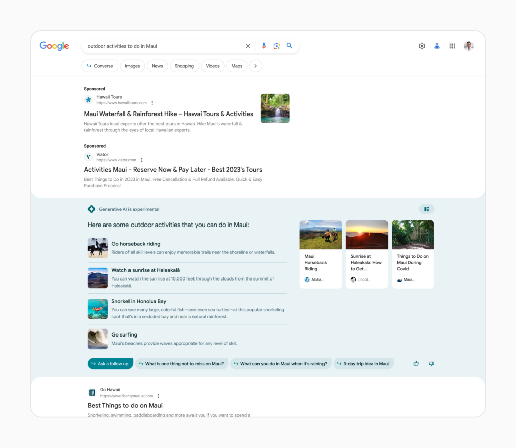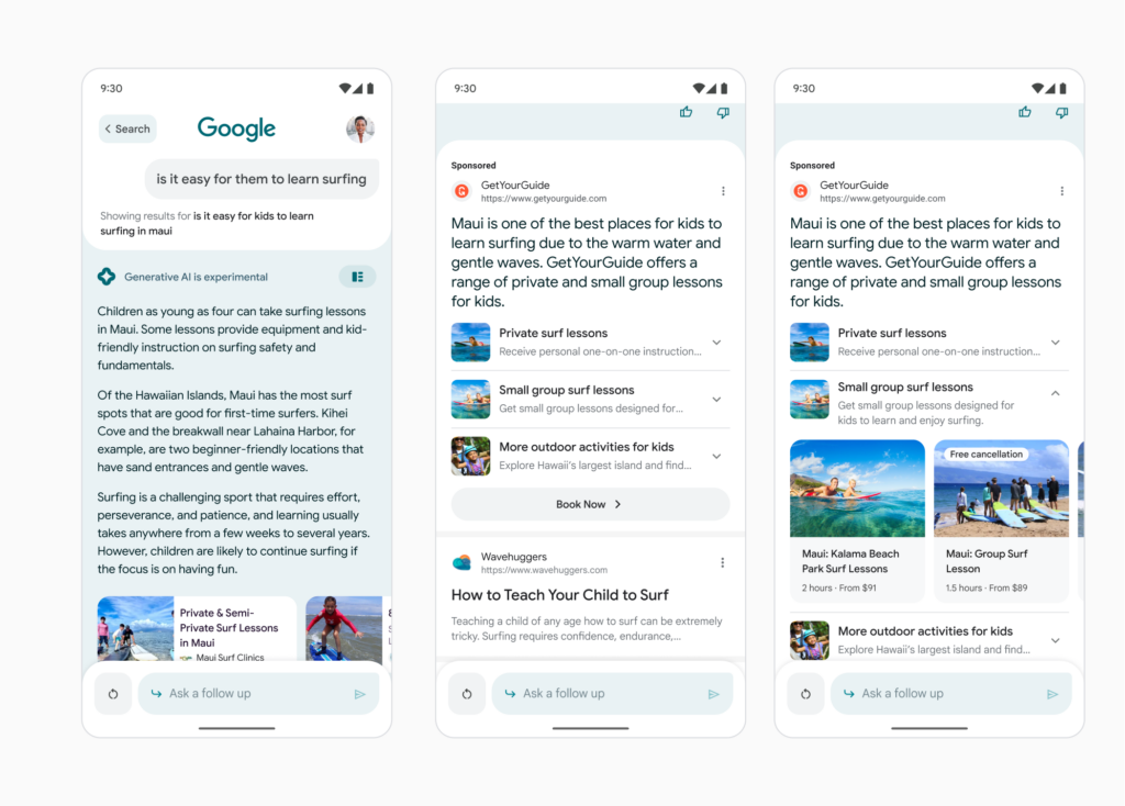 For example, a user researching “outdoor activities to do in Maui” and then refining the search to “activities for kids” and “surfing” may encounter a customized ad from a travel brand offering surfing lessons for kids. The ads will be clearly labeled as “Sponsored” to maintain transparency between advertisements and organic search results.
